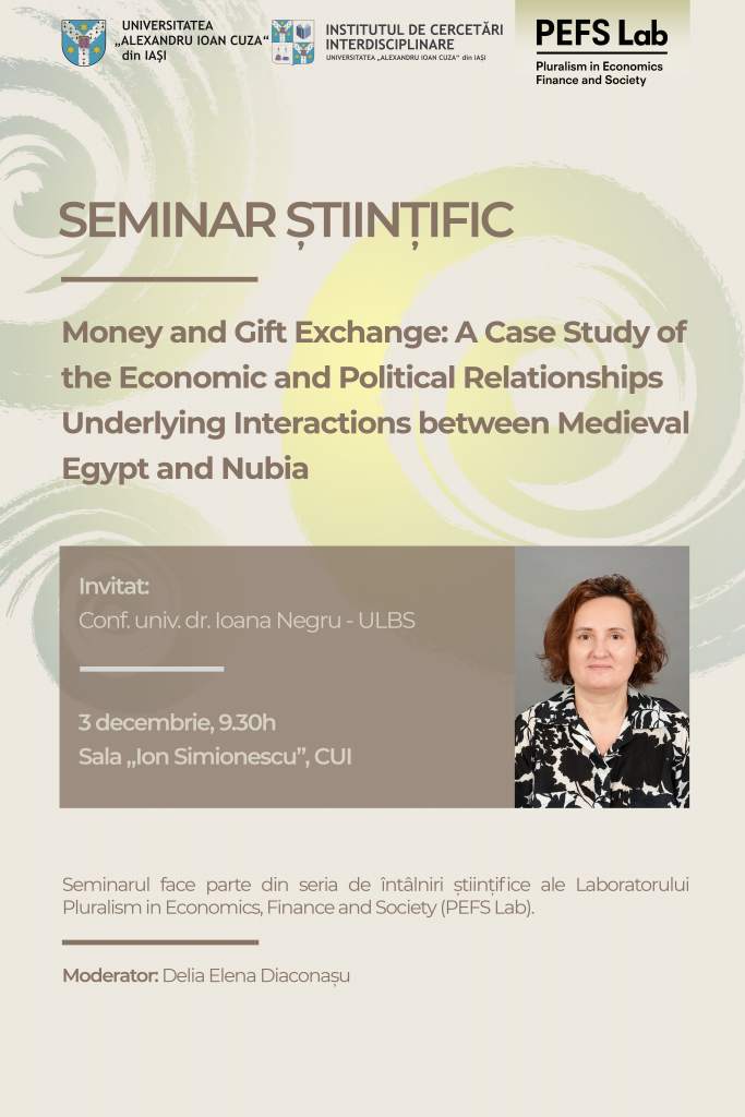 Avem plăcerea de a vă invita miercuri, 3 decembrie 2025, ora 9.30, în Sala „Ion Simionescu”, Casa Universitarilor din Iași, să participați la Seminarul științific intitulat Money and Gift Exchange: A Case Study of the Economic and Political Relationships Underlying Interactions between Medieval Egypt and Nubia, susținut de conf. univ. dr. Ioana Negru (Universitatea „Lucian Blaga” din Sibiu) și organizat de Pluralism in Economics, Finance and Society (PEFS) Lab din cadrul Departamentului de Științe Socio-Umane. Discuțiile vor fi moderate de CS III dr. Delia Elena Diaconaşu.