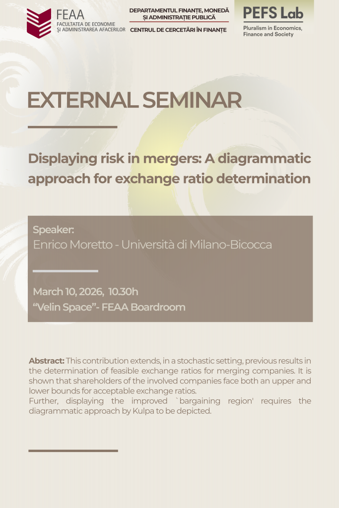 Avem plăcerea de a vă invita marți, 10 martie 2026, ora 10.30, în Sala Velin Space, Facultatea de Economie și Administrarea Afacerilor, să participați la Seminarul științific intitulat Displaying risk in mergers: a diagrammatic approach for exchange ratio determination, susținut de Enrico Moretto, Universita di Milano-Bicocca. Discuțiile vor fi moderate de CS III dr. Delia Elena Diaconaşu. …